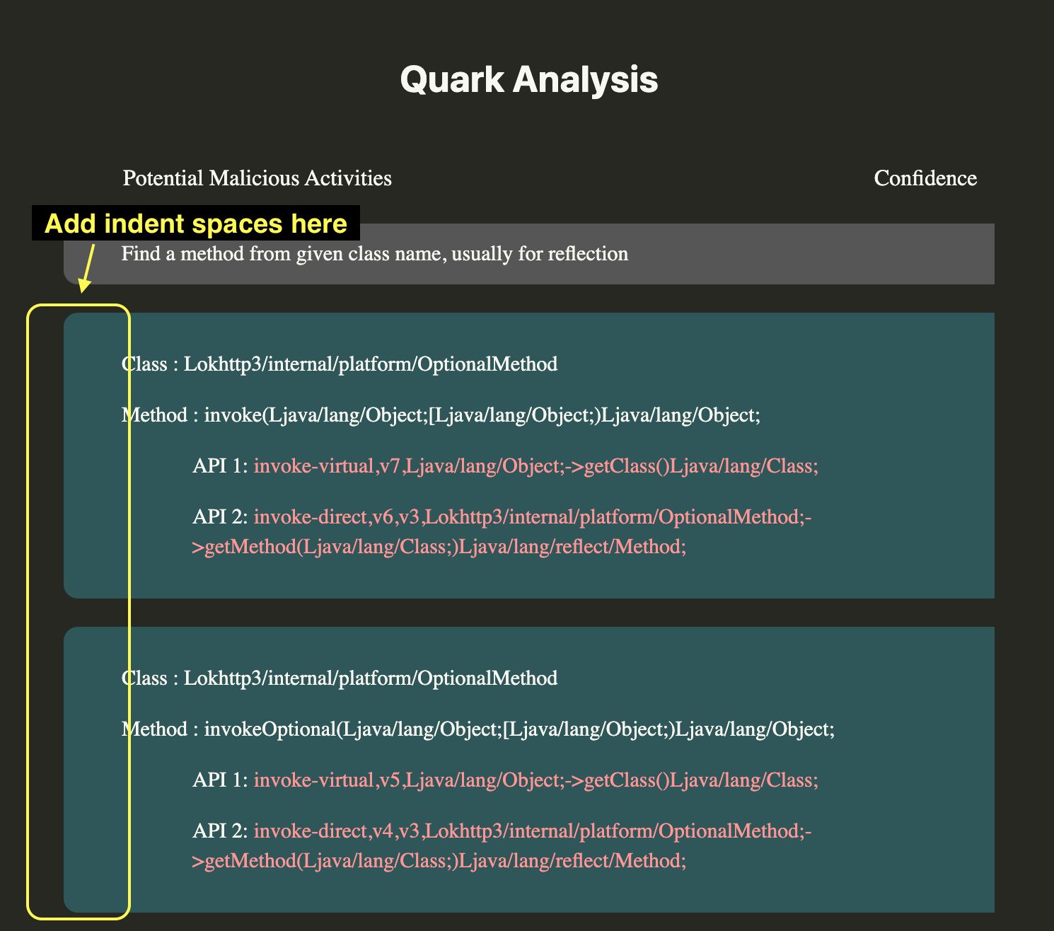 The sub-items for API information in the Quark report don't have indent spaces. So the users may be confused they are at the same level.