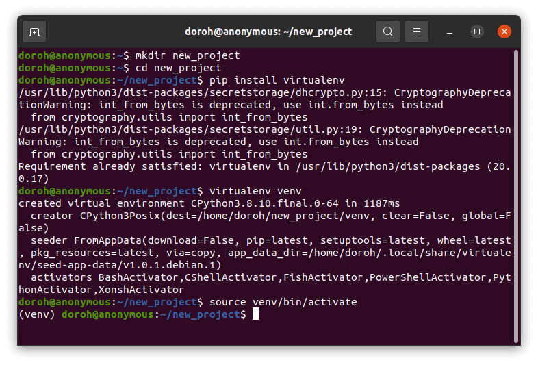 We will then create a virtual environment in the new_project. We will use a Python installer pip to install virtualenv, which is a tool for creating isolated virtual Python environments.