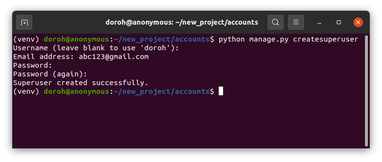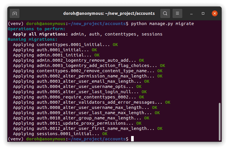 We will then use django-admin tool to generate a project folder. Let's call the project accounts: