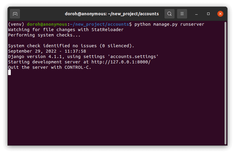 A Django project can have many apps under it. Let's create an app, and call it "account".