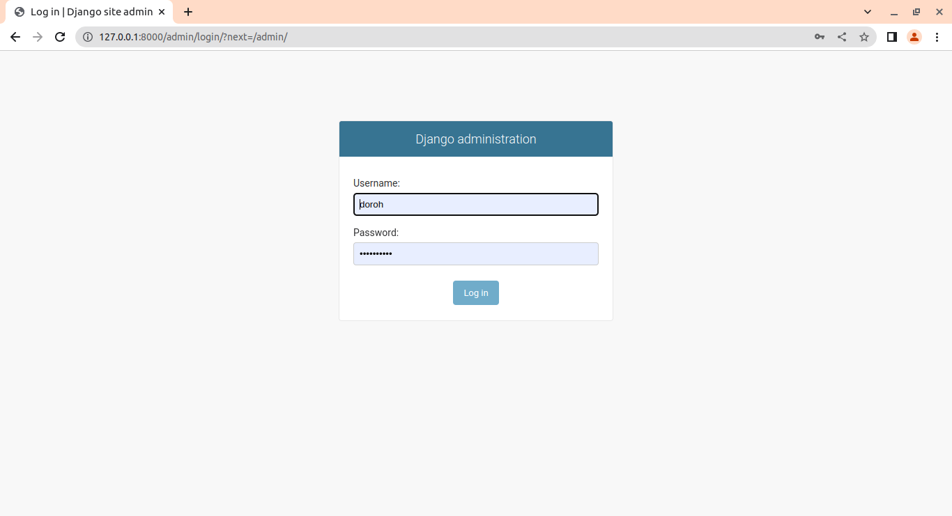 To access the admin site, enter http://127.0.0.1:8000/admin in the browser. Input username and password and log in: