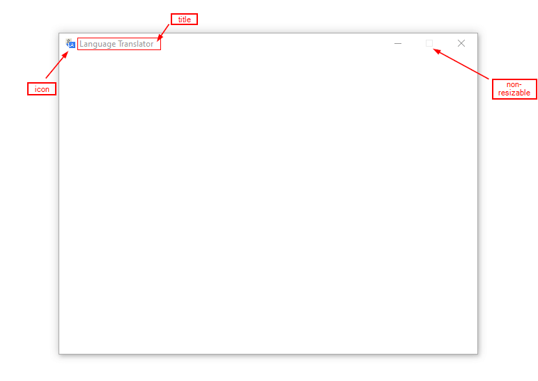self.master.geometry('600x430+300+150'): Sets the size and position of the window on the screen. The dimensions are 600 pixels wide by 430 pixels high, and the window is positioned 300 pixels to the right and 150 pixels down from the top left corner of the screen.self.master.title('Language Translator'): Sets the title of the window to "Language Translator".self.master.resizable(width=0, height=0): Disallows the window to be resized by the user, since 0 is passed as the argument for both the width and height parameters.icon = ttk.PhotoImage(file='icon.png'): Loads an image file named"icon.png"and creates aPhotoImageobject called icon that can be used as an icon for the window.self.master.iconphoto(False, icon): Sets the window icon to the icon PhotoImage object created earlier. False is passed as the first argument, which means the icon will be used for both the window icon and the taskbar.