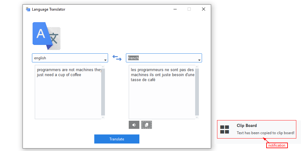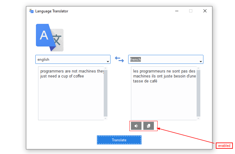 Great! Let's test our first translation, run the program and choose the source and destination language of your choice and provide a sentence you like to translate, hitting the Translate button you will get an output similar to this: