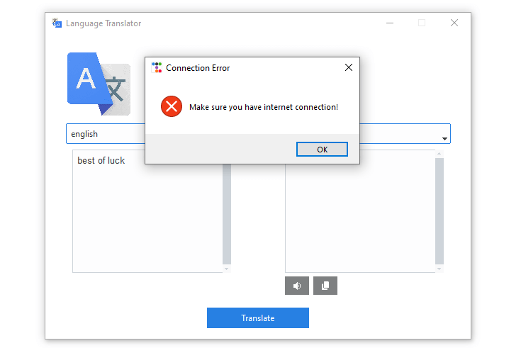 Suppose the user tries to translate whilst there is no internet connection, the app will generate this output: