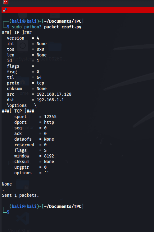 After crafting an IP layer, you can add additional layers, such as TCP, UDP, or ICMP. Here’s an example where we add a TCP layer to simulate a connection attempt to a specific port:
