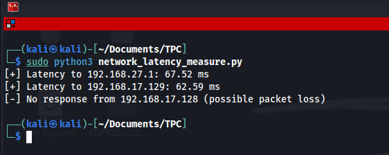 Result:from scapy.all import IP, ICMP, sr1 import time def check_latency(ip): packet = IP(dst=ip) / ICMP() start_time = time.time() response = sr1(packet, timeout=2, verbose=0) end_time = time.time() if response: latency = (end_time - start_time) * 1000 # Convert to milliseconds print(f"[+] Latency to {ip}: {latency:.2f} ms") else: print(f"[-] No response from {ip} (possible packet loss)") for server_ip in server_ips: check_latency(server_ip)