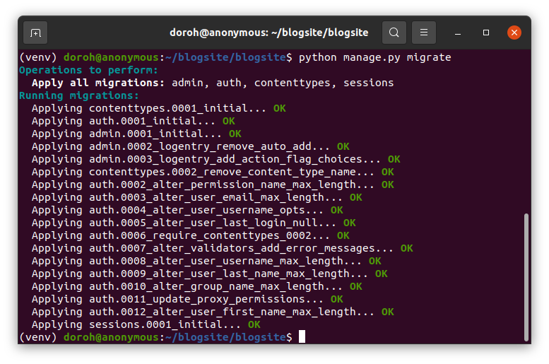Migrations are Django’s way of propagating model changes (adding a field, deleting a model, etc.) into your database schema. First, navigate to the project’s directory. Make sure it contains a manage.py file: